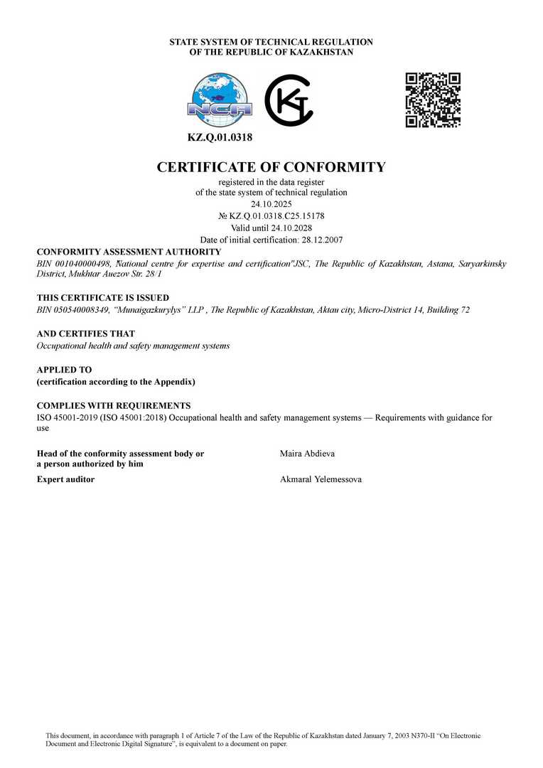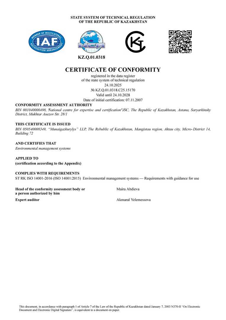 IMS has been certified in accordance to requirements of Quality Management Standard ST RK ISO 9001:2016, Environmental Management Standard ST RK ISO 14001:2016 and Industrial Labor Safety and Health Standard ST RK ISO 45001:2019.